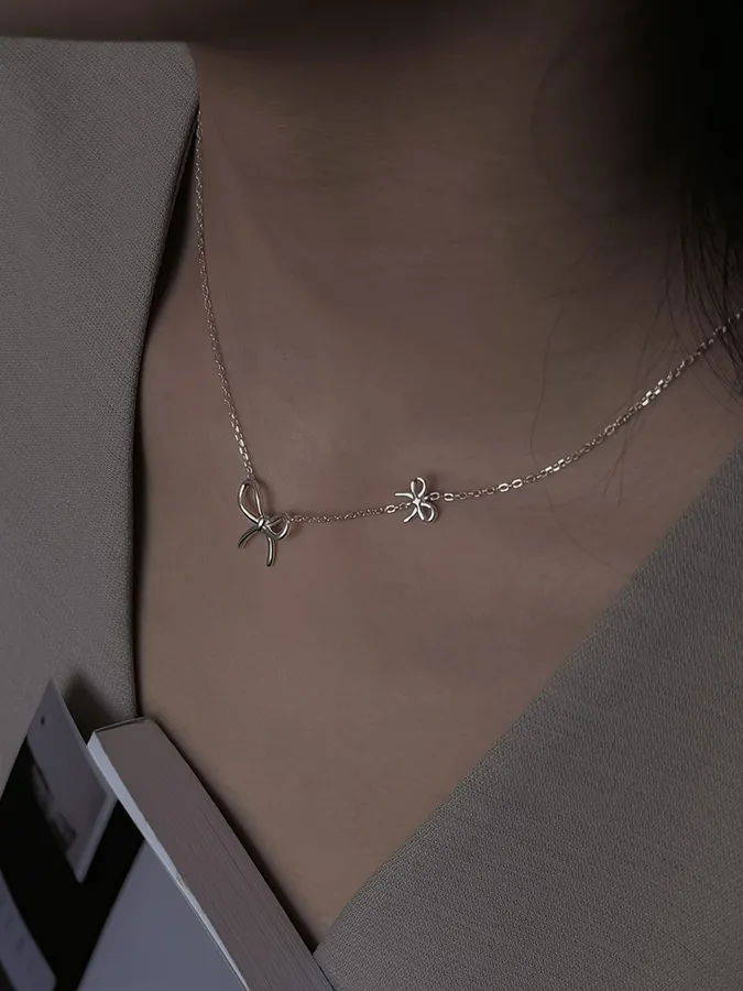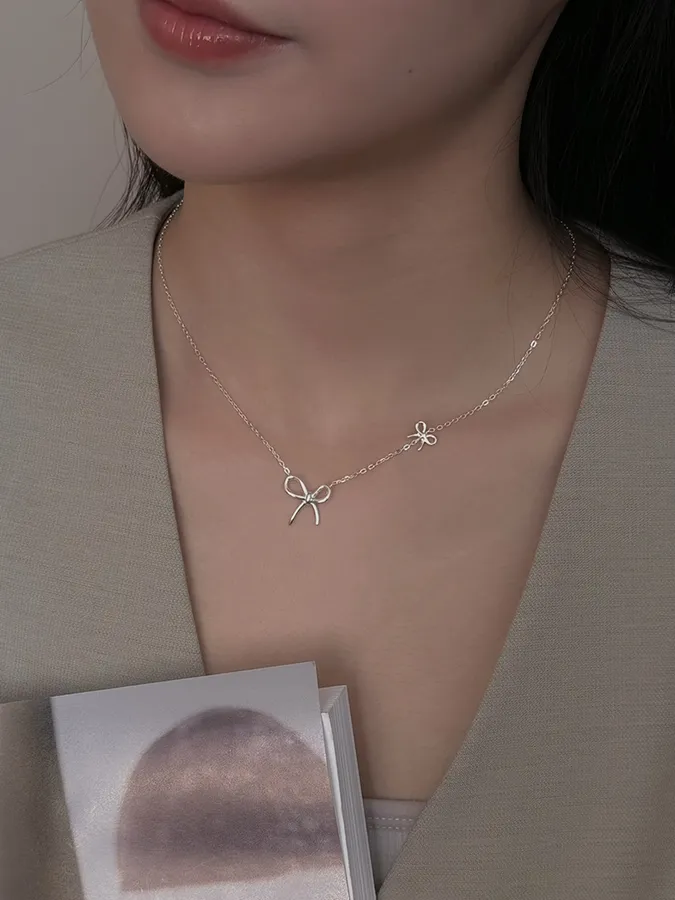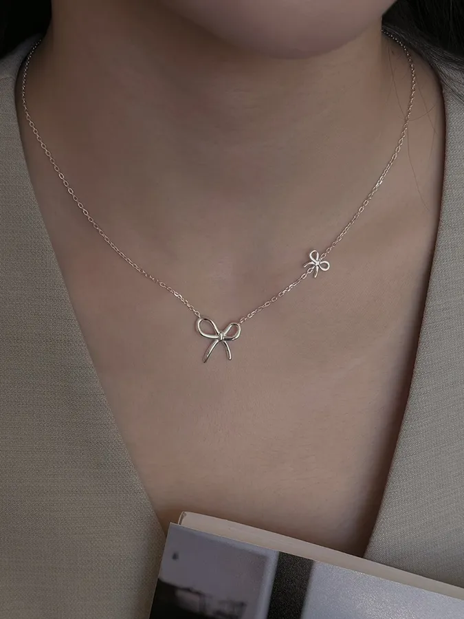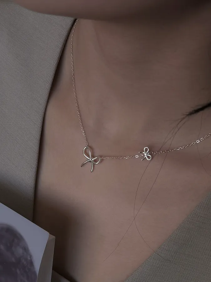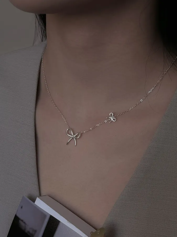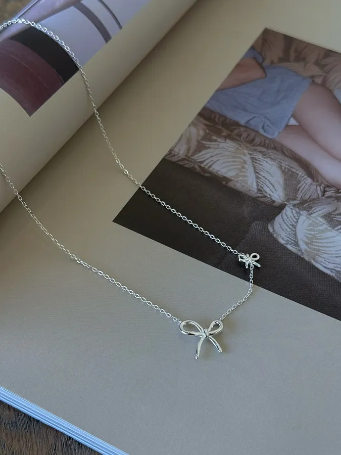 緞帶不對稱雙蝴蝶結|鎖骨項鍊【S925純銀】