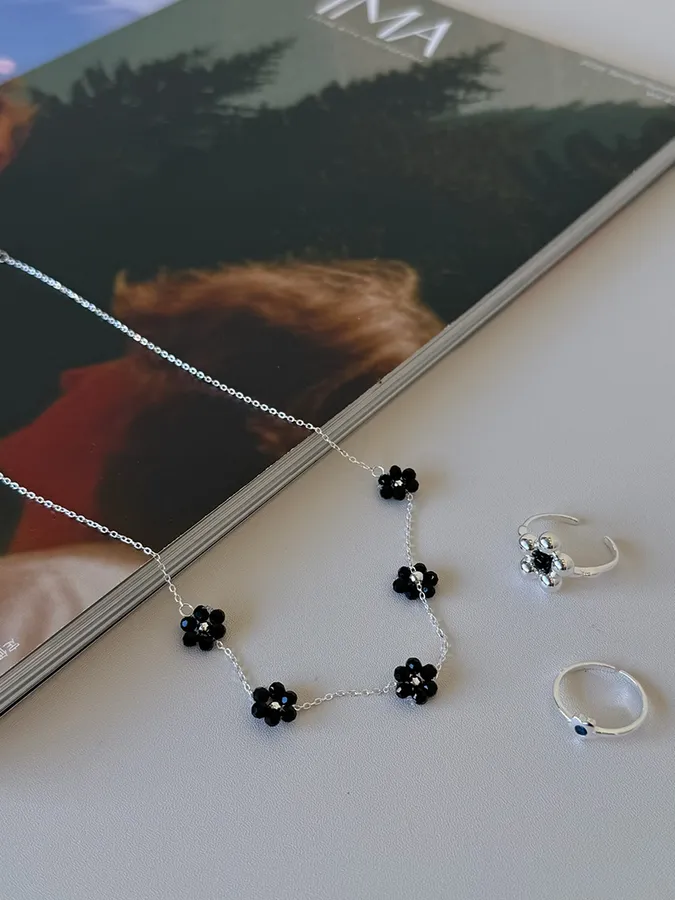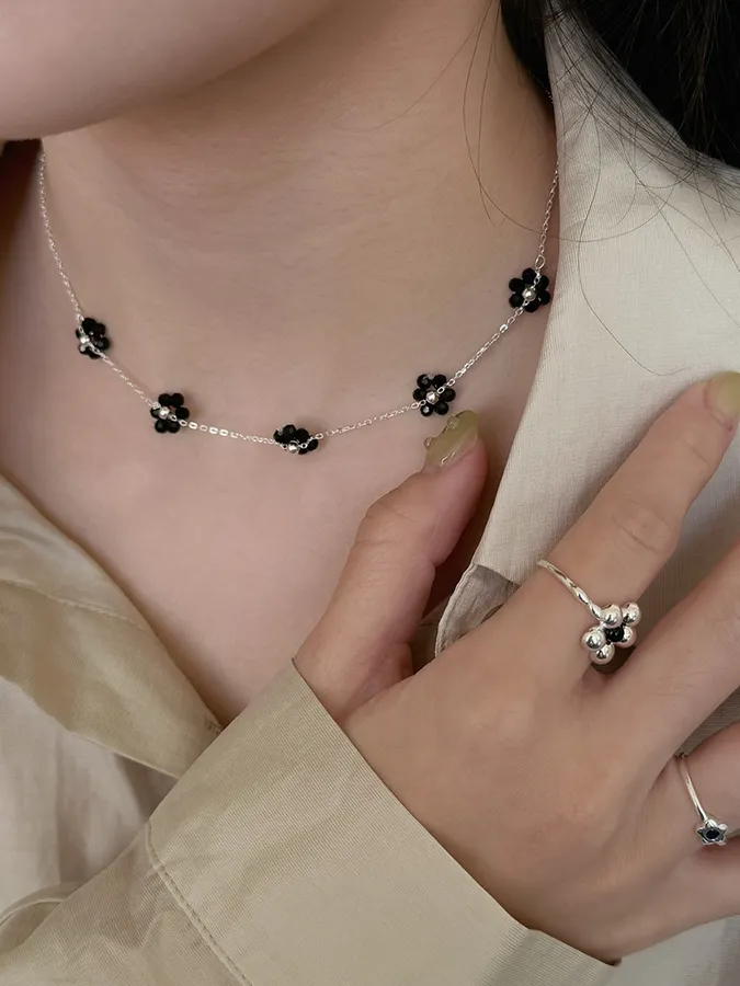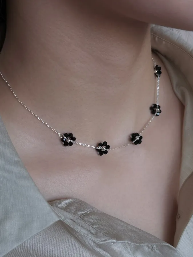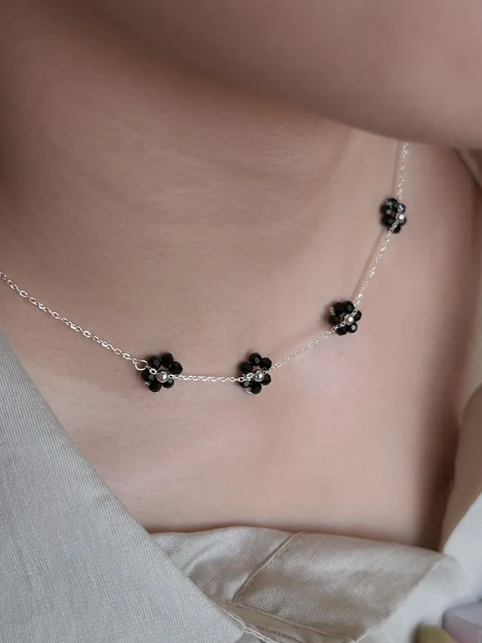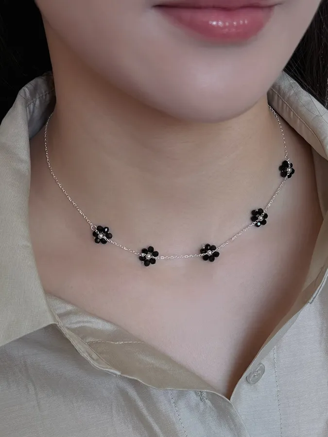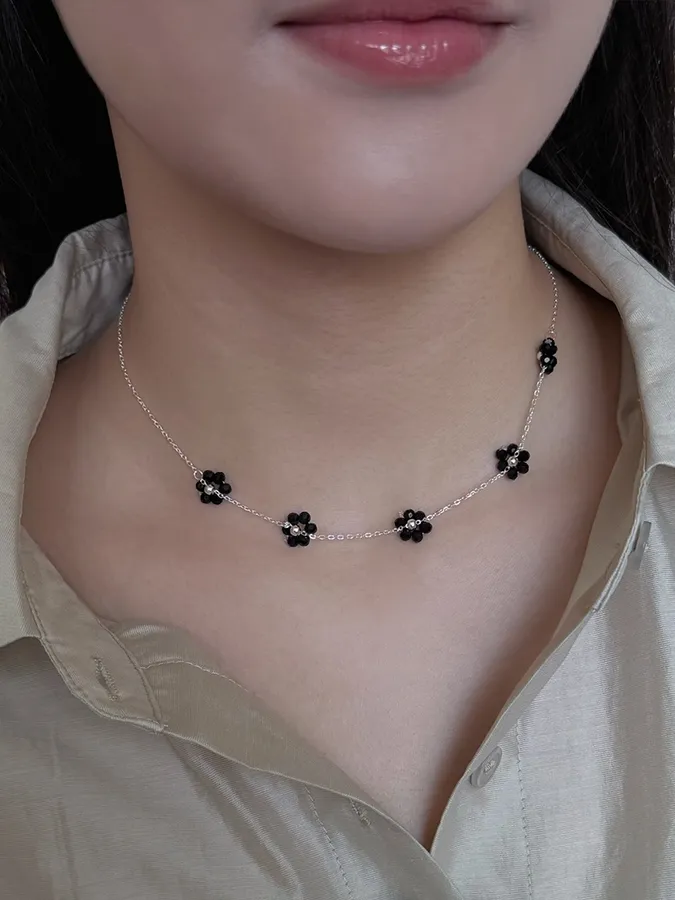 黑瑪瑙小花點綴|鎖骨項鍊【S925純銀】