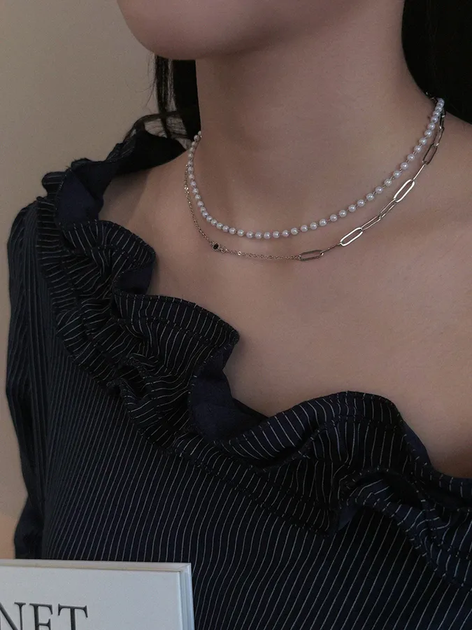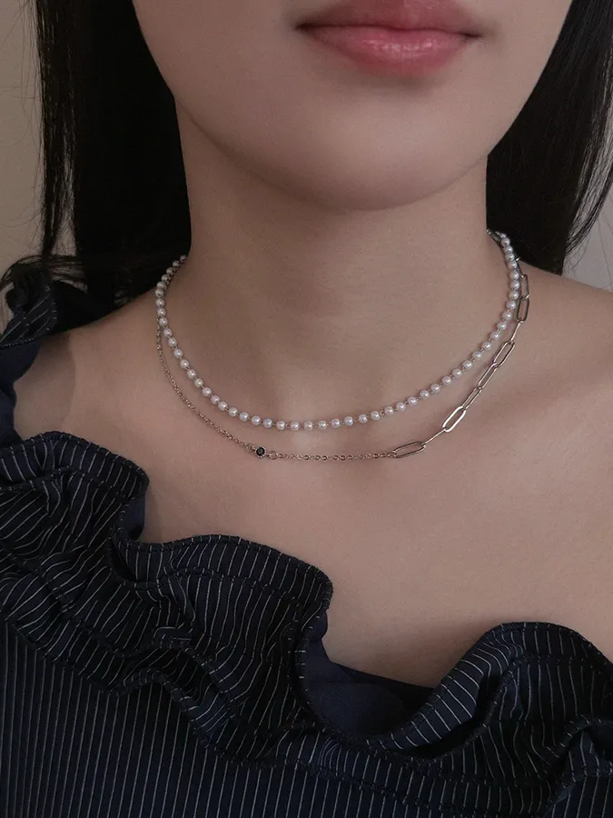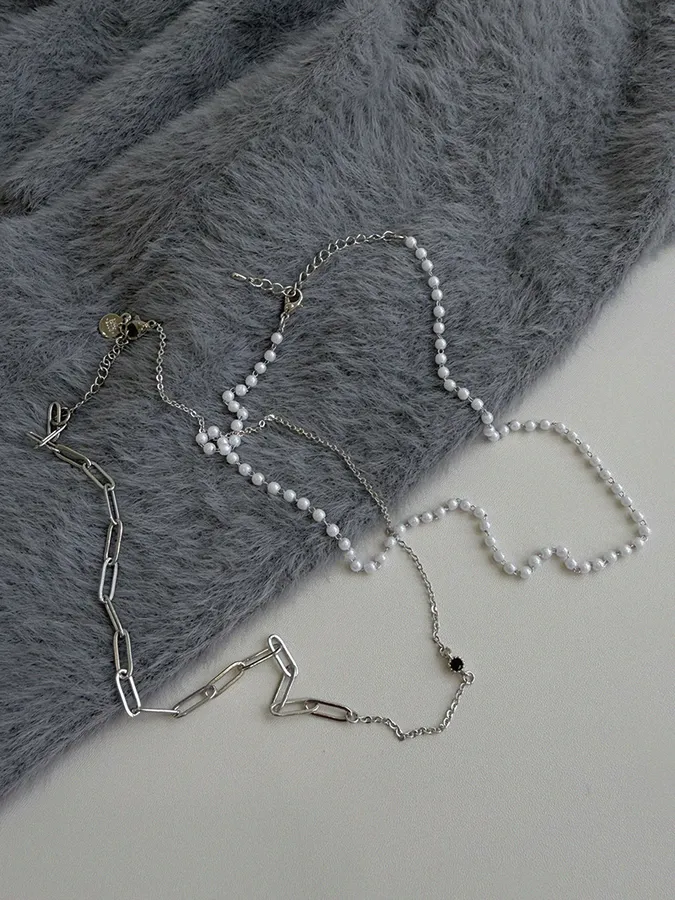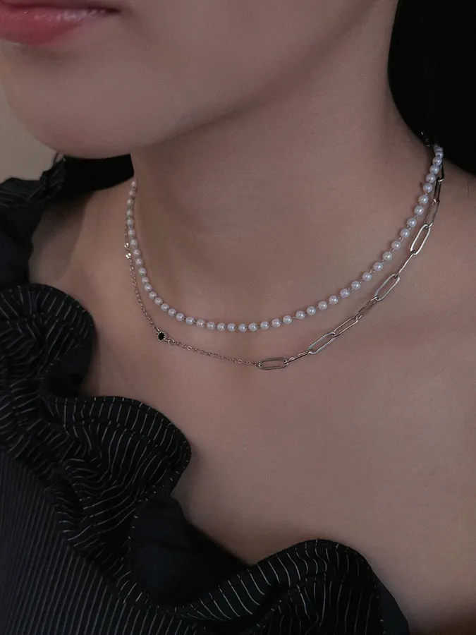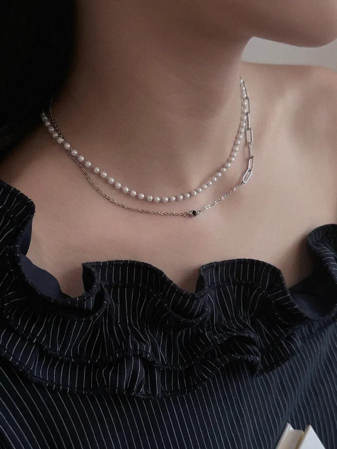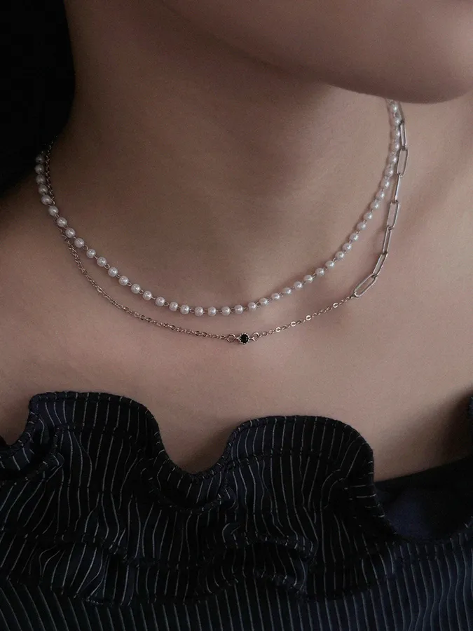 韓-黑鑽不對稱珍珠|雙層鎖骨項鍊